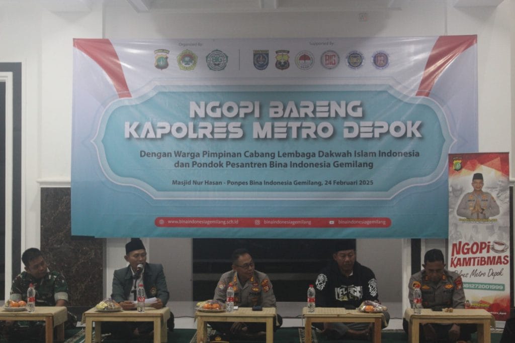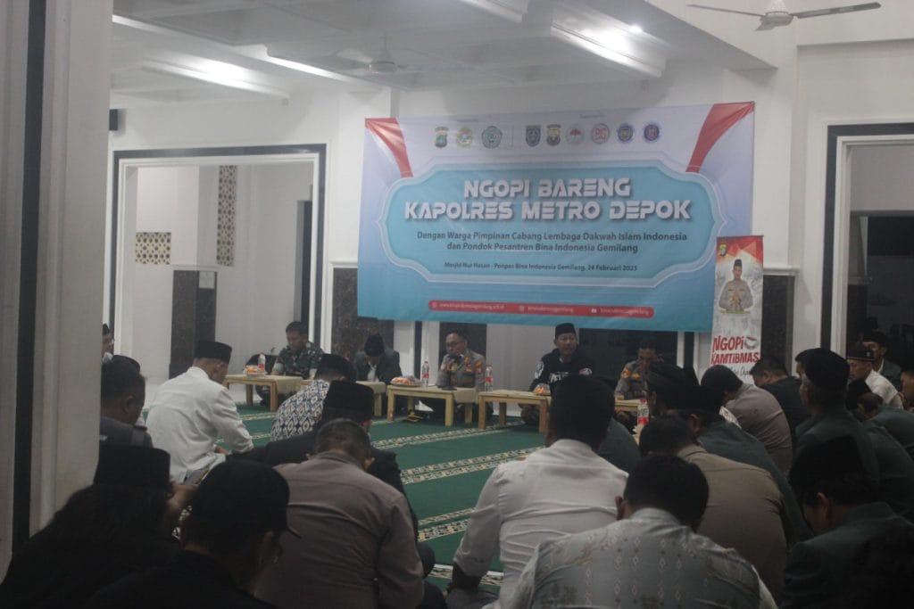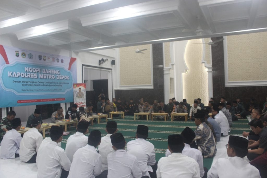 Limo, Depok (26/02). Pimpinan Cabang LDII Kecamatan Limo bersama Polres Metro Depok mengadakan kerjasama untuk menciptakan lingkungan yang aman dan tertib melalui acara “Ngopi Kamtibmas bersama warga PC LDII Kecamatan Limo,” acara tersebut bertempat di Masjid Nurhasan, Limo, Depok (24/02).